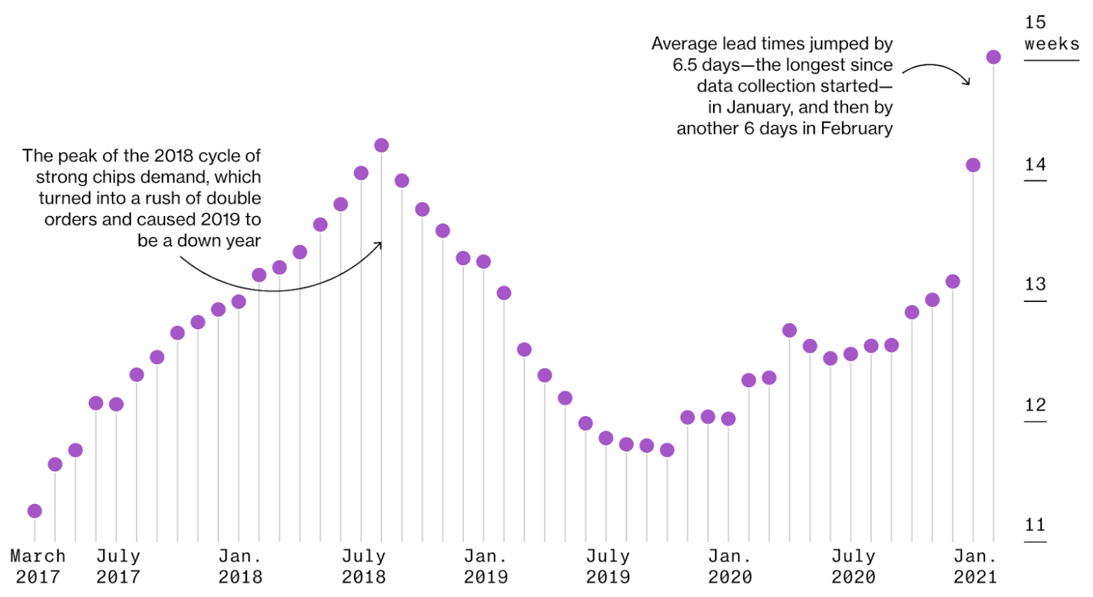 This event referenced the chip shortage experienced by technology companies across the world during the Covid pandemic. In 2020, demand toward smartphones, PC, wireless communications, and other electronic technologies surged. The lagging supply chain during the pandemic was incapable of handling the escalating demand, causing a stagnation in the supply. According to the graph provided by Bloomberg, the average lead time for chips surpassed the 2018 peak in February 2021.