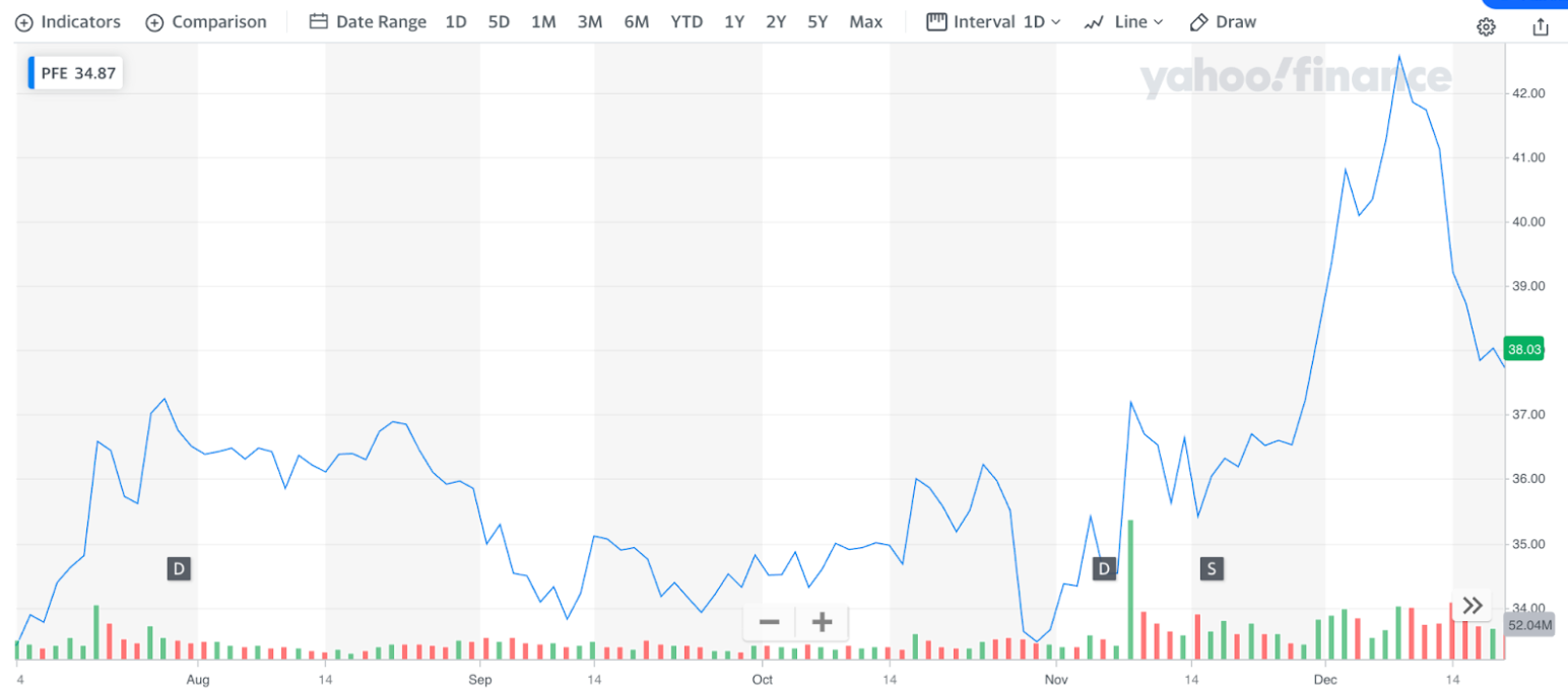 Pfizer stock price after releasing Covid vaccine; graph source: Yahoo Finance